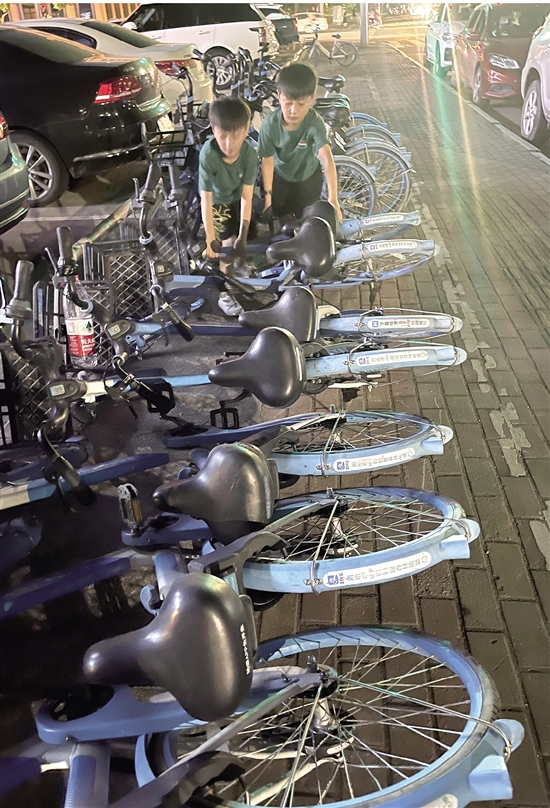 “小堡,快来帮我。”共享单车对才8岁的孩子来说确实有点沉,两兄弟互相协作,使出全力将单车一辆一辆扶起来。