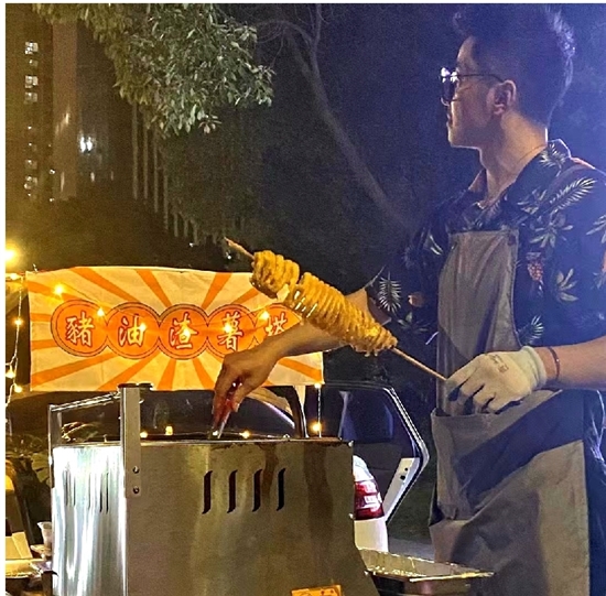 这个27岁的大溪小伙,专做“后备厢”夜市,卖的是猪油渣和薯塔。“我把在夜市中摆摊当作一种社交途径。”赵东波说。
