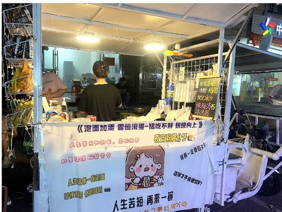 “人生就像一碗泡面,即便匆匆,依旧回味。”“人生苦短,再来一碗。”“人生若只如初见,来碗泡面,肚里满满,脑袋空空。”小陈的摊位上,写着很多有趣的文字。