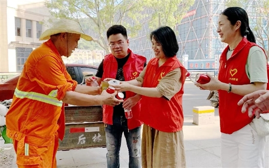 夏日持续高温,面对连日酷暑“烤”验,仍有很多户外工作者在辛勤地劳作,用汗水书写着责任与担当。温岭中学积极发挥省级文明单位带头示范作用,弘扬“奉献、友爱、互助、进步”志愿服务精神,组织开展“喜迎二十大 夏日送清凉”志愿活动,向环卫工作者分发矿泉水、绿豆汤、王老吉等消暑饮品,并细心叮嘱他们工作时一定要做好防暑工作。