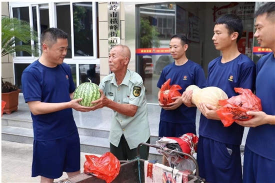令人吃惊的是,这已不是他第一次给横峰消防中队送来自种西瓜了,“每逢‘八一’、国庆,甚至春节他都会来慰问,夏天都是送西瓜,其他时候还会送来米和菜。算起来,这已经是连续第19个年头了。可以说,他见证了我们的成长。”横峰消防中队副中队长徐进军提及老人,言语中满是感慨与感激。