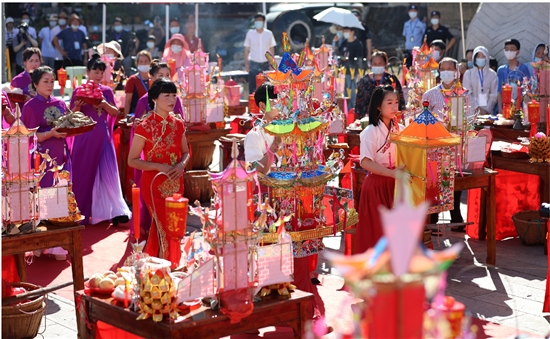 8月4日,石塘镇“小人节”现场,家长带着孩子向七娘妈(织女)行祈福礼。