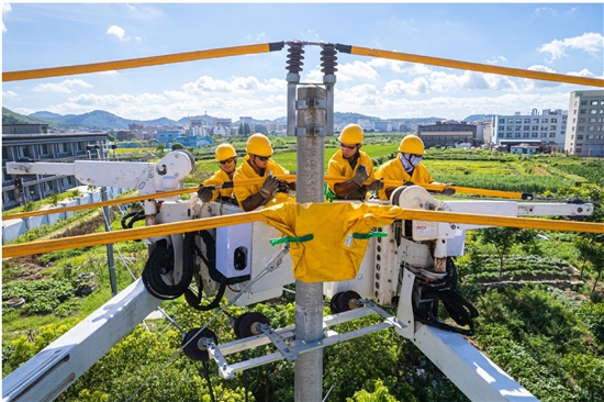 近日,大溪镇东岸村,国网温岭市供电公司带电作业班成员冒着36℃的高温,连续奋战3小时,完成10千伏毛坦线3号杆直线改耐张杆工作,为后续供电线路迁改让道“两高”温岭联络线做好准备。