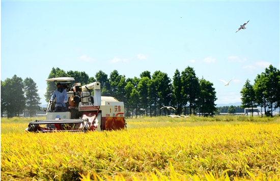 近日,在滨海镇新西村种粮大户王忠茂的承包地里,工人正驾驶收割机收割早稻。今年,王忠茂把东片农场附近的33亩杂地改造成良田,种植的早稻喜获丰收,亩产超千斤。