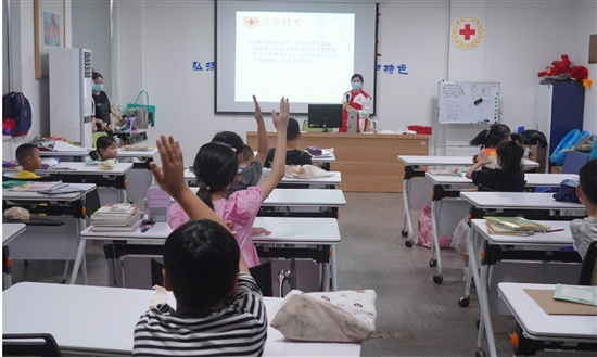 8月9日下午,在市第四人民医院,“医二代”们正在认真地向红十字救护师学习创伤包扎、心肺复苏等急救知识,获得了老师的连连肯定。