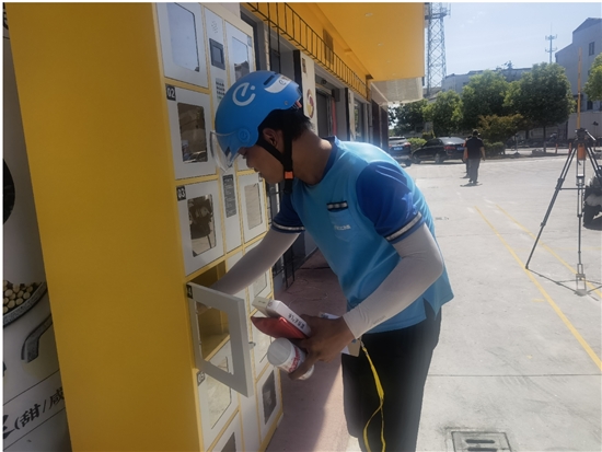 本报讯(记者郑灵芝 通讯员林绍禹文/图)8月19日上午11时许,阳光炙烤着大地。满头大汗的外卖小哥杜振龙来到新河镇冯源包子取外卖。店门口有一个黄色柜子,杜振龙拿出象征自己身份的“岭航骑士卡”。卡上有一个二维码,他扫了一下,便打开了柜门。他从柜子里拿出一瓶矿泉水,一饮而尽。
