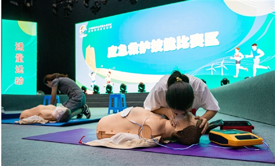 健康技能比赛现场,参赛队伍在做心肺复苏技能演示。