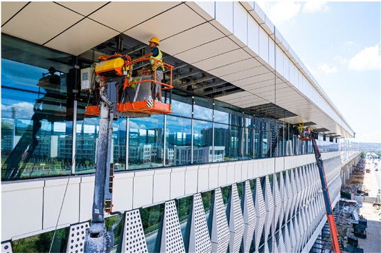 图为建筑工人正在安装城南站的室外檐口铝板。