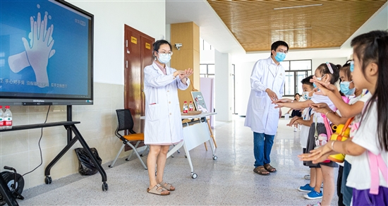 今年是九龙小学神童门校区正式启用的第一年。在新生开学的第一天,温岭市第一人民医院感染科的医护人员为九龙小学的学生进行了一校两区的健康科普宣传教育。据悉,这是该院感染科医护人员参与九龙小学开学活动的第三年。