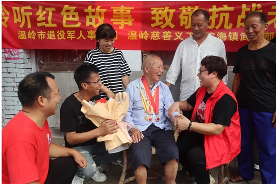 本报讯(记者叶琳 通讯员李丹文/图)9月3日是中国人民抗日战争暨世界反法西斯战争胜利77周年纪念日。当天,市退役军人事务局联合温岭慈善义工、滨海镇武装部开展“聆听红色故事,致敬抗战老兵”活动,铭记革命历史,传承红色基因,激发爱国情怀,向老兵致以崇高敬意和诚挚问候。