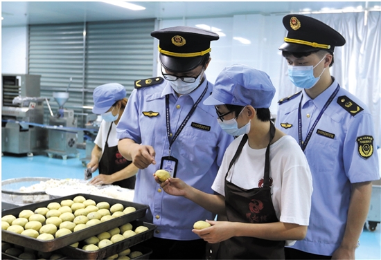近日,市市场监管局新河分局工作人员在一家月饼生产企业执法检查。