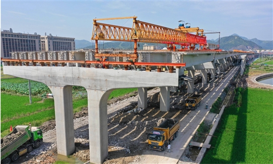 9月6日,甬台温高速至沿海高速温岭联络线大溪枢纽施工现场,中国水利水电第四工程局有限公司建设者在架设主线桥桥梁。