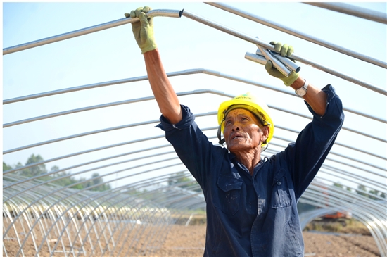 9月6日,滨海镇东片农场附近的一片坦地里,十多位农民正在用钢管搭棚,准备种植莴苣。
