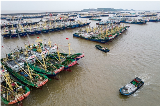 9月13日,受第12号台风“梅花”影响,我市沿海地区渔船纷纷进入各地渔港,加固缆绳,做好防台风准备工作。