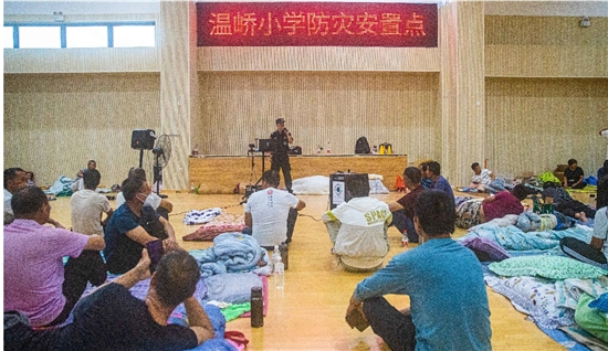 9月14日,在温峤镇中心小学避灾安置点,大部分人是附近在建工程施工人员。为了让他们在温岭感受到第二故乡的温暖,温峤派出所协警、新温岭人季瑜鸣特地带着自备小音箱,为他们带去“熟悉”的乡音,丰富安置人员的精神文化生活。