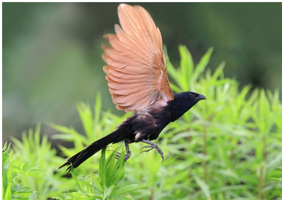 当天,鸟类摄影爱好者抓拍到一只通体黑色、肩翅栗色的鸟。它时而在芦苇之间蹿来蹿去,时而在草丛中驻足歇脚。凭借多年的鸟类观测经验,拍摄者判断该鸟就是小鸦鹃,极有可能正在筑巢。