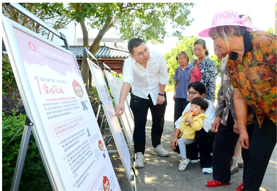 9月20日,在滨海镇中南村文化公园,纪检监察人员正在向群众宣传信访举报相关政策。