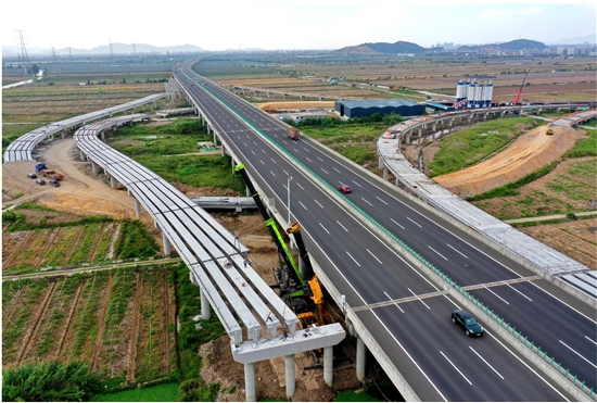 滨海枢纽是两高联络线终点,是连接沿海高速的控制性工程,在完成全部桩基施工后,目前正有序进入梁板架设、桥面系施工,项目形象进度完成70%,枢纽形象初步呈现。
