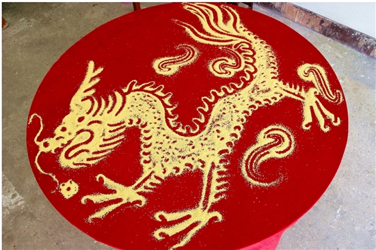 马若琦介绍,由于这门技艺在民国时出现断层,一般米粒画者习惯把一堆米倒在桌案上,然后摊铺作画,这样作画只能呈现单色;而漏米作画则是古法米粒画的一种,是作画者直接握米在手,再通过掌间漏米的方式直接摊铺在桌案上,手到之处、用力大小,即成画笔成线、轻重泼面,且根据不同结构,随时更换不同品种、颜色的米粒进行匀色、添色,远观似立体彩墨国画,极富艺术感。