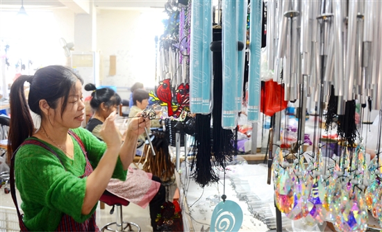 10月10日,在滨海镇奇美工艺品有限公司生产线上,员工们正在忙着赶订单制作风铃。