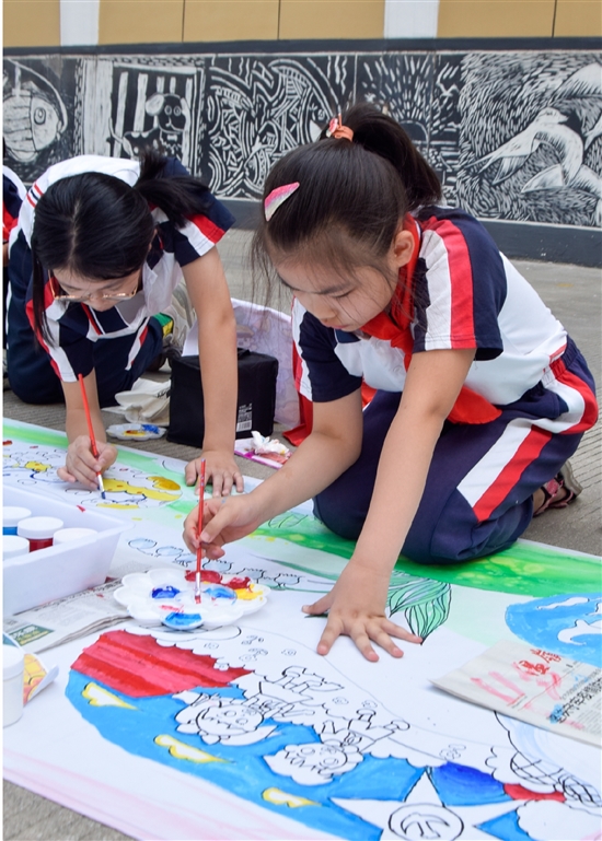 学生们花了一个多小时创作,天马行空、色彩鲜艳、充满童趣的作品跃然卷上,一起组成了百米长卷巨幅作品,表达着对城市文明的美好愿景。