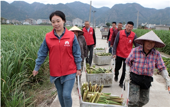 日前,新河镇郑洋新村党员干部帮助茭农运送茭白。