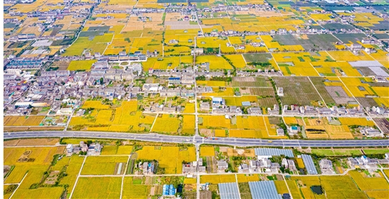近日,石松一级公路新河段两侧,金色的稻田把大地装扮得多姿多彩。记者 徐伟杰摄