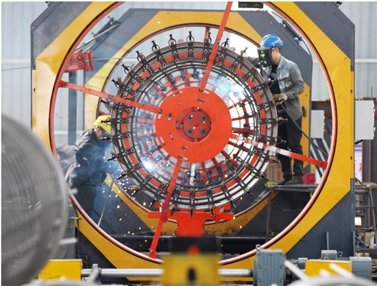 日前,温玉铁路温岭西站站前一标项目经理部钢筋加工厂,焊花飞溅,建设者在紧张有序地焊接桥墩钢筋笼。