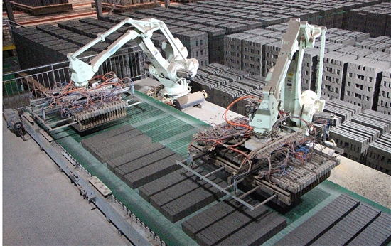11月15日,位于箬横镇的台州市达嘉新型墙体材料有限公司里,两组机器人码砖机利用智能控制系统,精准地将流水线上的一方方砖坯抓取到自然固化台基上。该机器人码砖机设备一分钟可抓取5次,每次码砖量达108块,生产效率是人工操作的50倍,可实现年产1.2亿块绿色环保建材非粘土烧结砖,达到了既有产量又有科技含量的生产功效。 通讯员 江文辉摄
