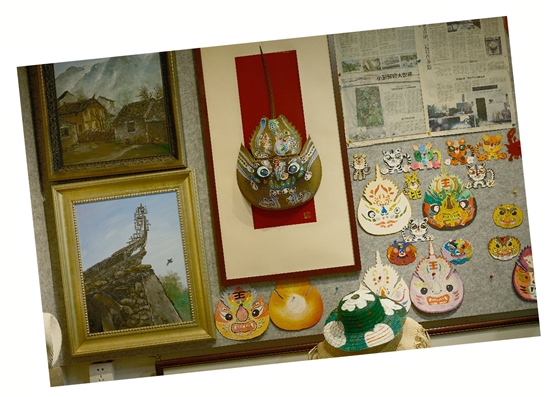 陈祥来工作室,原是村两委成员吴建勇家的老房子,屋后是个废弃猪圈。老屋经过修葺,基本保持了原来的格局,但里面塞满了各种艺术品:字画、鲎壳画、木刻微雕、立体的小人节扎纸及参考《海错图》创作的海洋生物画作,每件都出自陈祥来之手。