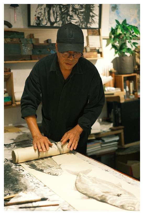 记者去的时候,陈祥来先生正在画《鱼画集》,提笔起落间,一条生动的鱼已跃然纸上。
