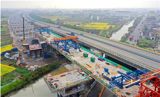 温岭“两高”联络线新河2号高架桥跨木城河右幅悬臂连续现浇梁日前已合龙,打通了预制梁运送通道,攻下工程施工关键节点,促进T梁生产和梁板架设进入新的施工高峰。 记者 刘振清摄