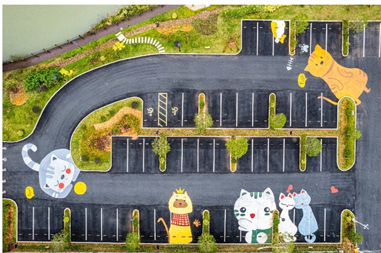 绿色掩映下,干净整齐的停车场内,绘满了各色卡通形象,美观中又带着一些可爱。