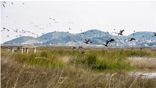 龙门湖省级湿地公园位于温岭经济开发区中片,面积约520公顷,其中公园区块绿化面积约168公顷,湖面水体面积约254公顷,生态自然资源良好,集近海与海岸湿地、湖泊湿地、沼泽和沼泽化草甸湿地、人工湿地四大湿地类型于一体,在浙江沿海地区极具典型性和代表性。随着天气逐渐变冷,连日来,当地已迎来了候鸟迁徙过境高峰期,过境的鸟类达20余种,包括白额雁、斑嘴鸭、针尾鸭、黑脸琵鹭等。