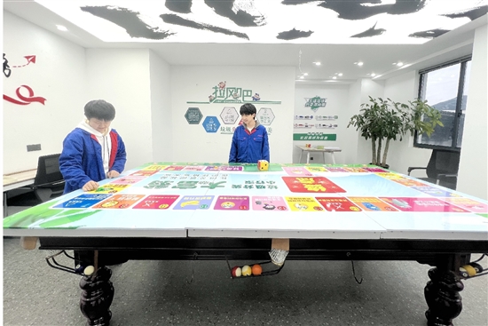 拉风吧位于员工活动室,是10月份建成的。“大富翁”游戏处是由台球桌改造的,员工们通过游戏,可以进一步掌握垃圾分类知识。
