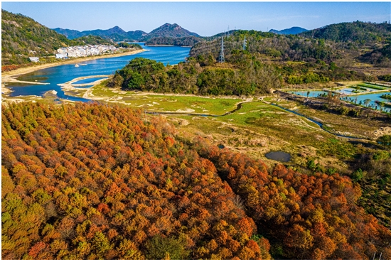 眼下,正值水杉林红叶落的时候。12月22日,航拍下的湖漫水库水杉林层林尽染,美丽如画,在冬日暖阳的照耀下,宛如大自然无意间打翻的调色盘。一棵树一处景,一片林一派风光,色彩斑斓的水杉树美出了一番更胜春色的冬日盛景,吸引游客前来观赏拍照。