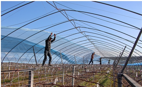 12月21日下午,箬横镇下轩村,种植户正组织工人对当地50多亩葡萄种植园开展大棚盖膜作业。
