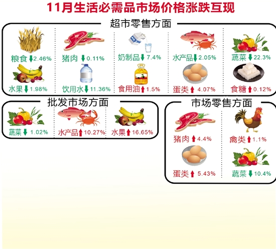 蔬菜批零价格持续下降。11月份天气逐渐转凉,蔬菜生长速度加快,本地时令蔬菜陆续上市,加之外运蔬菜调运量的增加,带动蔬菜价格整体回落。12月份我市降温降雨天气增多,对蔬菜生长运输都将造成不利影响,价格也进入季节性上涨区间,预计后期蔬菜价格将呈稳中上行的态势运行。
