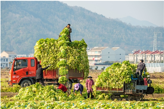 近日,在石桥头镇土坦新村,菜农们正在田间地头收割雪里蕻,打捆、搬运、装车,一派繁忙景象。