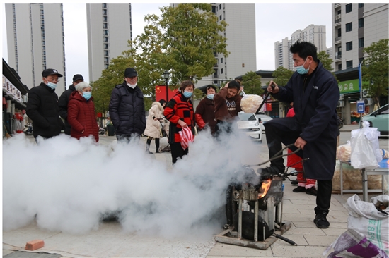 近日,在横峰街道川安华庭小区内,一位打炒米的师傅正在用老式爆米花机为市民打炒米。