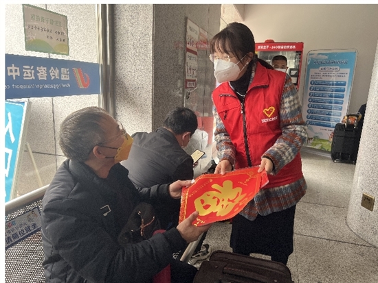 本报讯(记者赵云 通讯员黄清伟文/图)“送您春联,祝您平平安安回家!”1月12日,旅客王先生拖着行李进入市客运中心,青年志愿者送上了春联和福字。