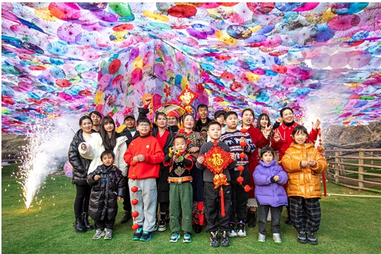 近日,城南镇“后岭花开·嬉栖谷”搭建了由近一万把油纸伞组成的“天空之伞”,吸引了众多市民前来游玩。两位嫁至当地的少数民族同胞带着丈夫、孩子,和亲朋好友们一起,前来打卡留影,感受多元文化。
