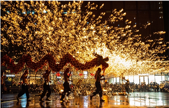 近日,随着夜幕降临,宝龙广场上演了非遗技艺“火龙钢花”。舞龙者在温度高达1500℃的“铁水流星”下舞动,气势磅礴、美轮美奂,吸引众多市民、游客前来观赏,欢乐庆元宵。