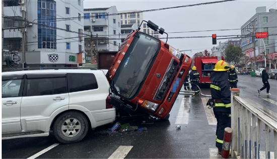 2月5日12时41分许,泽国交警中队接到当事人吴某报警称:他驾驶小客车在泽国镇温北路与复兴路路口掉头的过程中,突然被一辆货车压到车尾,所幸无人员受伤。