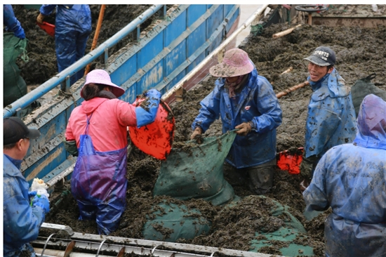 岸上,一位来自椒江的收购商告诉记者,这批收购来的湿紫菜将被拉到福建进行加工。她还说,新鲜的紫菜,放点大蒜、醋、白糖、酱油等调味品,加工一下就很好吃了。这个记者也曾吃过,确实美味。她得知记者来意后,叫记者去找边上南港村党支部书记潘妙华的妻子,这些装运的紫菜,有一部分是潘妙华家养殖的。