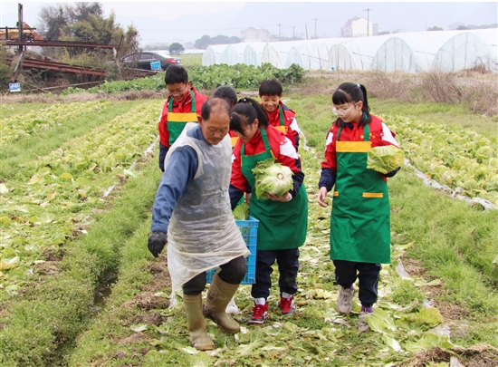 2月17日,箬横镇汇头林村,志愿者、箬横镇第四小学的教师和学生们都在帮忙采收大白菜。大家装的装,运的运,分工有序,干得热火朝天。