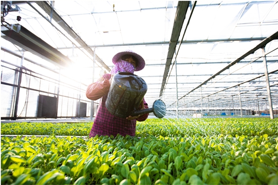 近日,滨海镇吉麟种苗基地里,工人正在智能温室内管护幼苗。