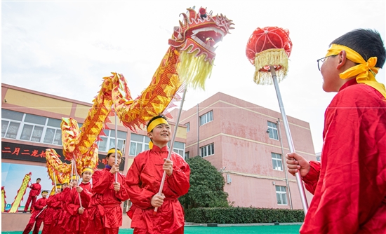 本报讯(记者江潇扬/文 徐伟杰/图)2月20日,在箬横镇第三小学的操场上,一条金色长龙翻腾起舞。当天,学生们通过表演舞龙、民谣传唱,制作龙尾等多种形式,了解“龙抬头”传统民俗文化知识等内容,迎接“二月二”。