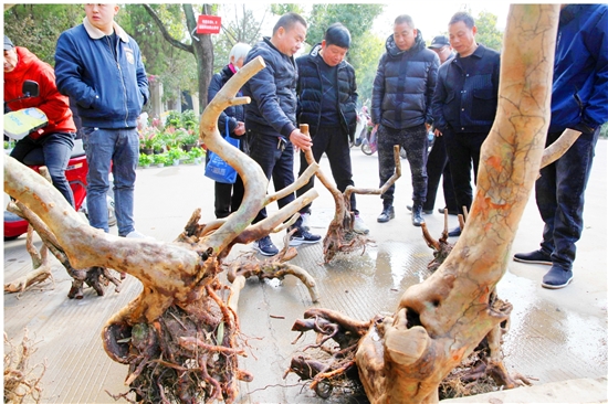 2月23日,泽国镇集市,数位市民在评议、选购树桩。