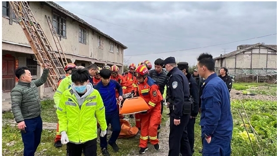 本报讯(记者郑灵芝 通讯员陈星星 江赛南文/图)2月27日上午9时25分,市消防救援大队接到报警,称箬横镇百亩坦村村委会边上,一位老人被困楼顶,十分危险。箬横派出所民警和城东消防救援站、箬横专职消防队的专业救援人员立即赶赴现场。